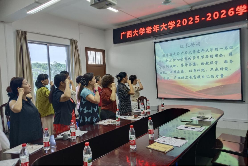 紧接着,会议进入庄严的班长宣誓环节。全体班长在领誓人王静班长的带领下,高举右拳,郑重宣誓。铿锵誓言回荡会场,彰显出班长们奉献银龄事业、服务老年教育的坚定决心。
